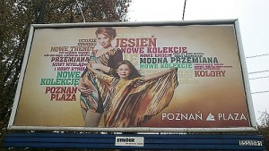 Na pierwszy rzut oka – prawdopodobnie na zasadzie kontrastu wobec całego przekazu właśnie to widać od razu – to reklama centrum handlowego Poznań Plaza, choć tezie tej (być może zbyt śmiałej) przeczy obrazek. I on też się w oczy rzuca, przynajmniej mnie. A na obrazku pani „trochę” w ciąży i dziecko, nieco mniej się rzucające. Do tego ubiory w kolorach jesieni. I w takich samych kolorach napisy – może za wyjątkiem zielonego, bo to mało jesienna barwa jest, ale wszystko inne się zgadza.